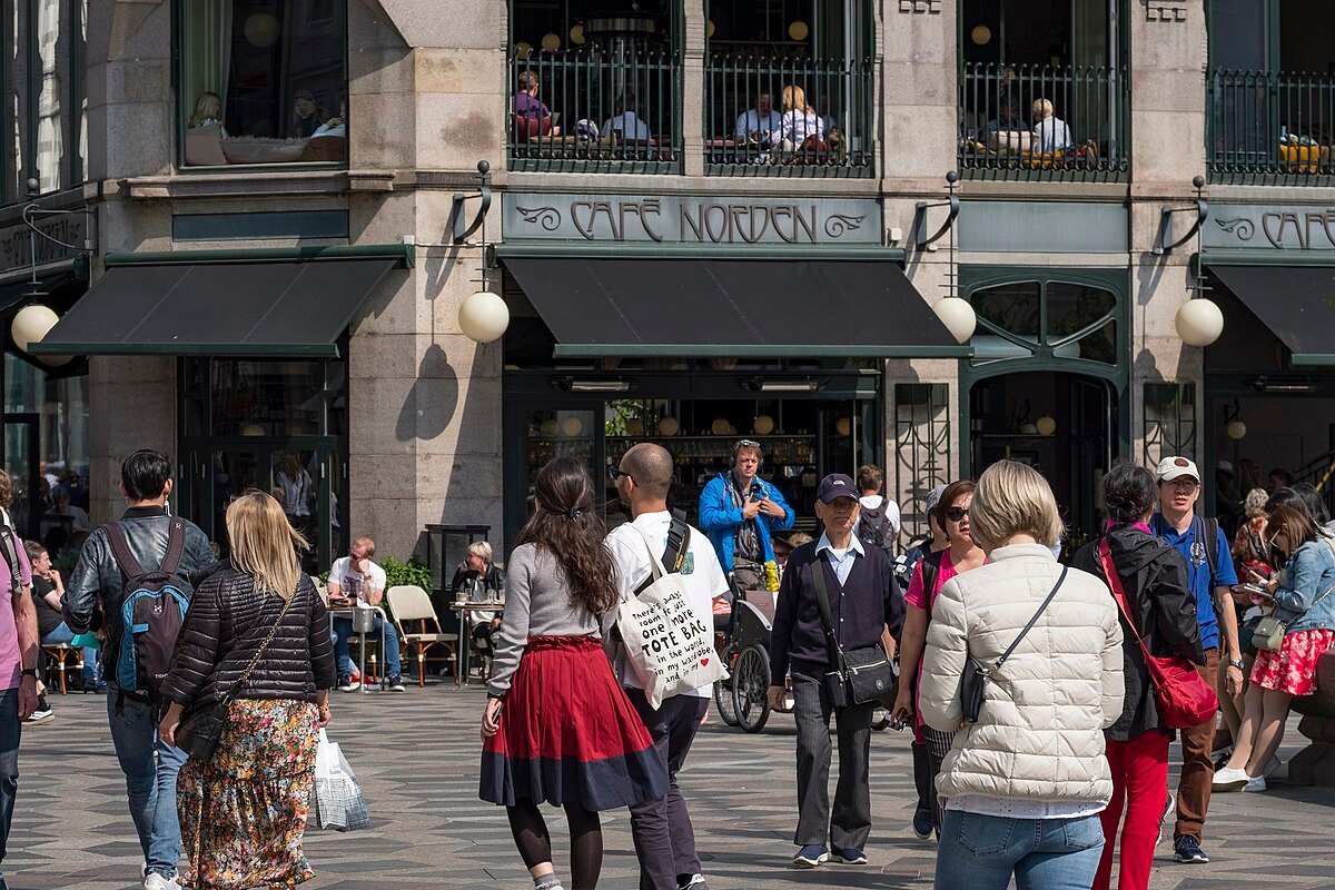 Grand cafe overlooking Stroget with classic Danish cuisine and terrace seating.
